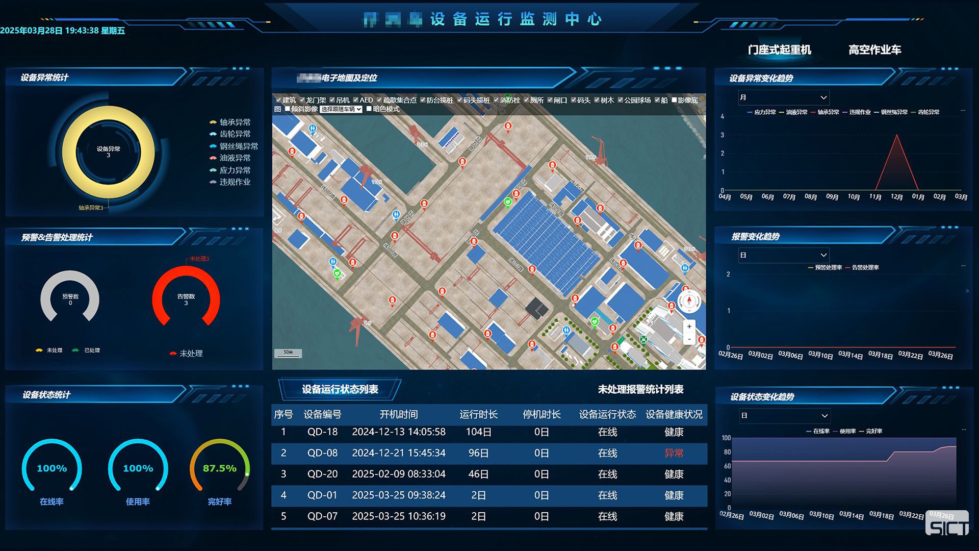 面向船舶制造關(guān)鍵裝備打造的網(wǎng)絡(luò)化、智能化的運(yùn)行狀態(tài)監(jiān)測與故障診斷一體化平臺。能夠?qū)﹂T座吊機(jī)、高空作業(yè)車等核心設(shè)備的溫度、振動、應(yīng)力、傾斜等運(yùn)行參數(shù)實(shí)時(shí)采集,結(jié)合多源傳感器融合、遠(yuǎn)程通信和智能診斷算法,實(shí)現(xiàn)對設(shè)備狀態(tài)的全面感知與潛在異常的精準(zhǔn)識別。同時(shí),通過可視化手段,直觀呈現(xiàn)設(shè)備運(yùn)行狀況和風(fēng)險(xiǎn)預(yù)警,并與運(yùn)維流程深度聯(lián)動,形成監(jiān)測、預(yù)警、決策與執(zhí)行的閉環(huán)管理,有效提升制造裝備的運(yùn)維效率,全面增強(qiáng)船舶制造過程的安全性、穩(wěn)定性與管理水平。