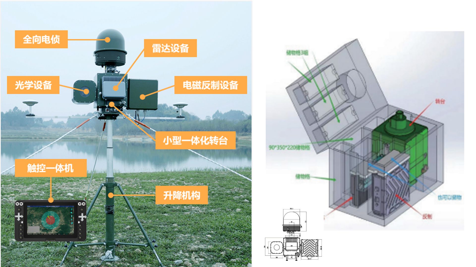 智能化、小型化、模塊化的便攜式反無人機裝備,專為野外作戰(zhàn)、臨時營地防御、能源要地防護、重要建筑與大型活動低空安防等場景設計。系統(tǒng)集成雷達、光學、無線電信號等多模態(tài)融合偵察手段,可對低空無人機目標實現(xiàn)快速搜索、高效識別,并通過發(fā)射大功率干擾信號,使無人機失去控制。